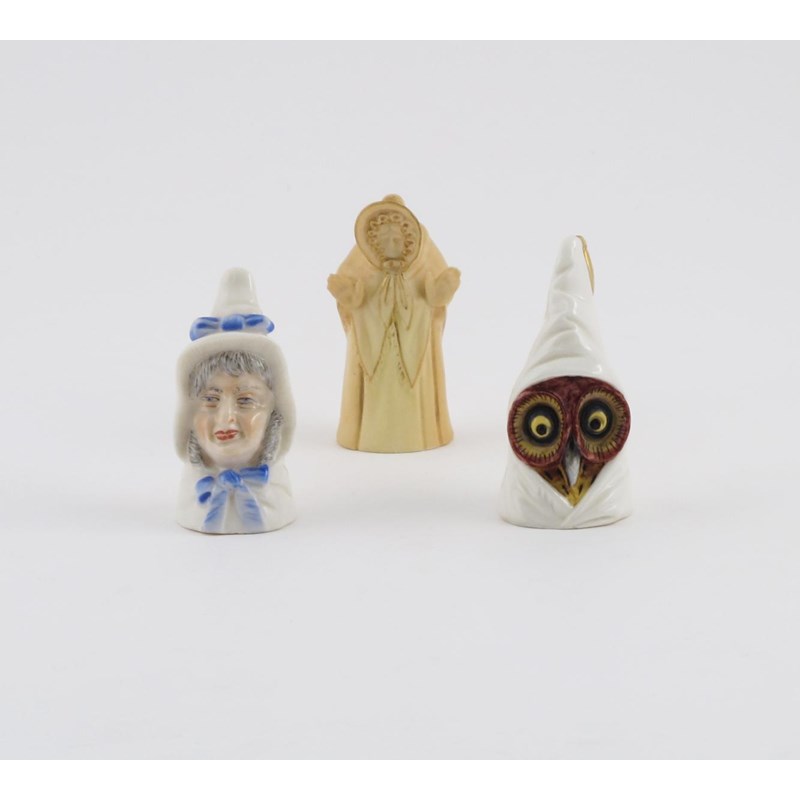 Three Royal Worcester candle snuffers late 19th/early 20th century, one of Mrs Caudle, one of an owl wearing a tasselled cloak, and one of Granny Snow in blush porcelain, printed marks, 7.5cm max. (3)