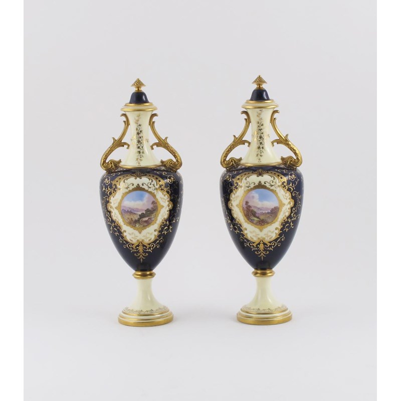 A pair of Coalport two-handled vases late 19th/early 20th century, painted with landscape panels within elaborate gilt and cream borders on a deep blue ground, printed marks, 36cm. (4)