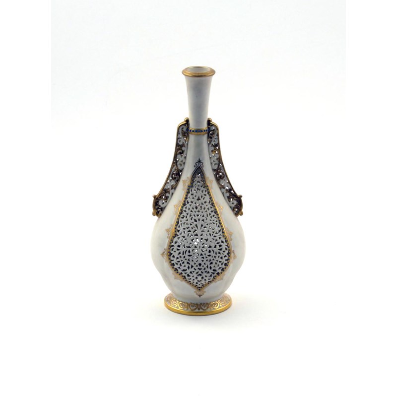 A Grainger's Worcester reticulated vase late 19th century, of Islamic shape, probably by Alfred Barry, pierced to two sides with a panel of elaborate leaf scrolls within a blue jewelled border, some good restoration to the neck, 30cm.