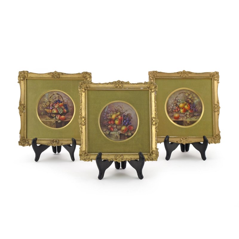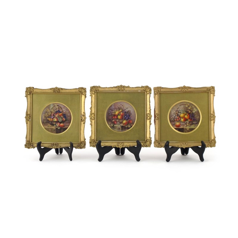 Three good Royal Worcester circular plaques c.1914-18, painted by Richard Sebright with baskets of fruit and flowers spilling over onto tabletops, signed, date codes for 1914 and 1918, framed and glazed, the plaques 10cm dia. (3)