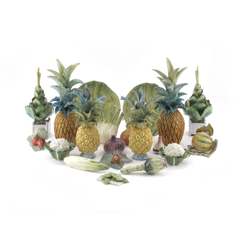 A large group of ceramic trompe l'oeil models of fruit and vegetables 20th century, in pottery and porcelain, several pieces with monograms for Lady Anne Gordon, Dowager Marchioness of Aberdeen, including cauliflower boxes, strawberries, pineapples, an onion and an artichoke, some damages, 30cm max. (22)