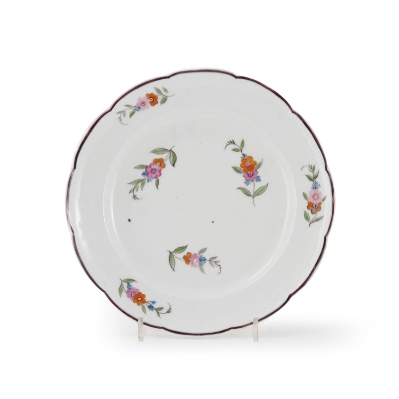 A Nantgarw 'chocolate'-edged plate c.1820, moulded with a delicate 'piecrust' rim and naively painted, probably by Thomas Pardoe, with six simple floral sprays, impressed mark, 23.5cm.