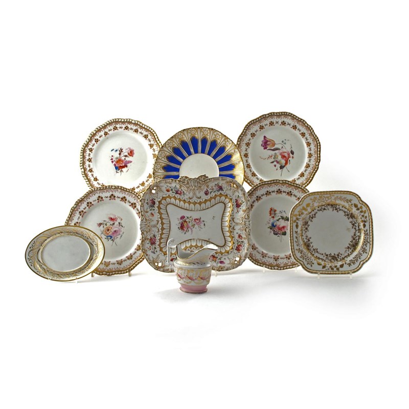Four Spode Felspar porcelain plates 1st half 19th century, painted in pattern 4033 with floral arrangements within gilt and red borders, three other English porcelain plates or dishes, a Barr, Flight & Barr teapot stand with a gilt foliate border, and a pink and gilt cream jug, 27.7cm max. (9)