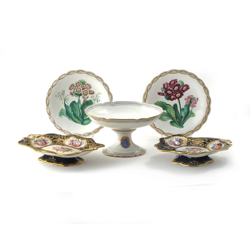 Two Davenport shaped dishes c.1840-60, painted with floral vignettes reserved on a blue ground, each raised on a low foot, a pair of English porcelain tazzae painted with botanical specimens in pattern 6838, and a Paris porcelain tazza with a monogram to the foot, 27.5cm max. (5)