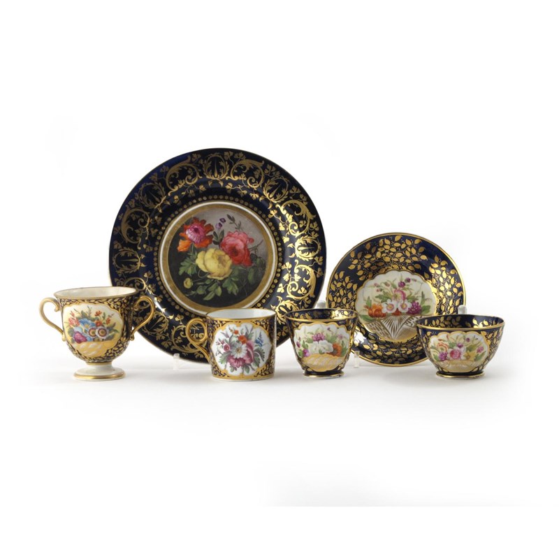 A Minton trio c.1830, decorated in pattern 876 with flowers issuing from gilt shell motifs reserved on a cobalt blue ground with gilt leaves, a matching coffee can, a two-handled Minton cabinet cup decorated in the similar pattern 780, and a cabinet plate painted with rose and peony within a gilt and blue border, a crack to the cabinet cup, 21.7cm. (6)