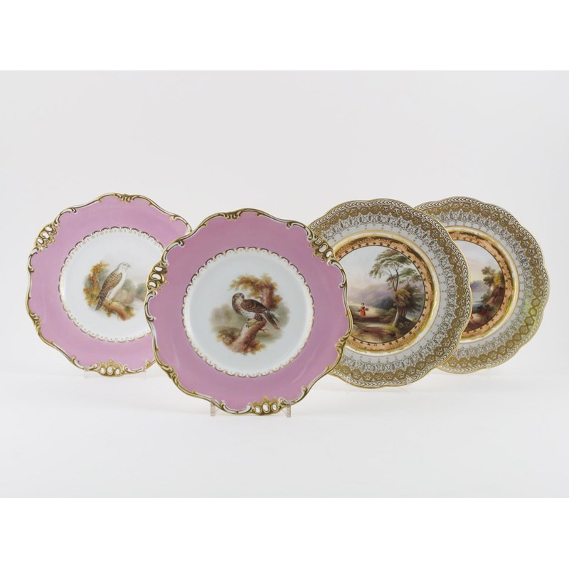 Two pairs of Davenport porcelain plates c.1840-50, one pair decorated with birds within shaped and reticulated pink borders, titled 'Common Buzzard' and 'Jer Falcon' to the reverse, the other pair with landscape scenes of Lake Albano and a view of Wales, 24cm. (4)