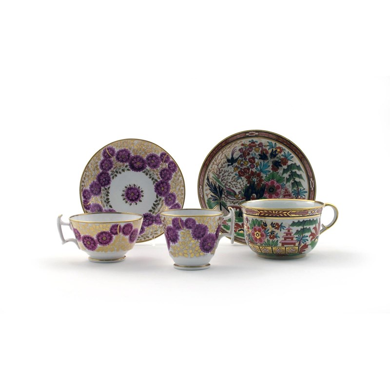 A Barr Flight and Barr Worcester breakfast cup and saucer c.1810, brightly decorated with an Imari type pattern of birds in an Oriental garden, impressed and printed marks, and a Derby trio decorated with a rich design of purple flowerheads on a gilt leaf ground, 16cm max. (5)