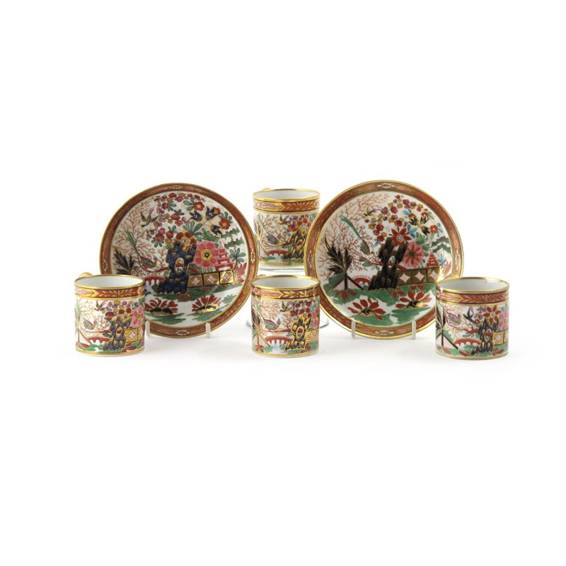 Four Barr Flight and Barr Worcester coffee cans and two saucers c.1810-20, decorated in a bright Japan design with a pink pagoda and blue rockwork in a lavish garden setting, a small bird perched above a bridge, impressed marks, one saucer broken and restuck, 14cm. (6)