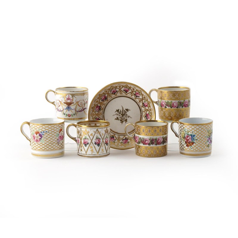 Four Derby coffee cans and a saucer c.1800-10, two cans decorated in pattern 529 with a band of pink roses reserved on a salmon ground, one in pattern 576, the can and saucer in pattern 626, and two further coffee cans with floral arrangements against a gilt scale ground, puce factory marks to most, 13cm. (7)