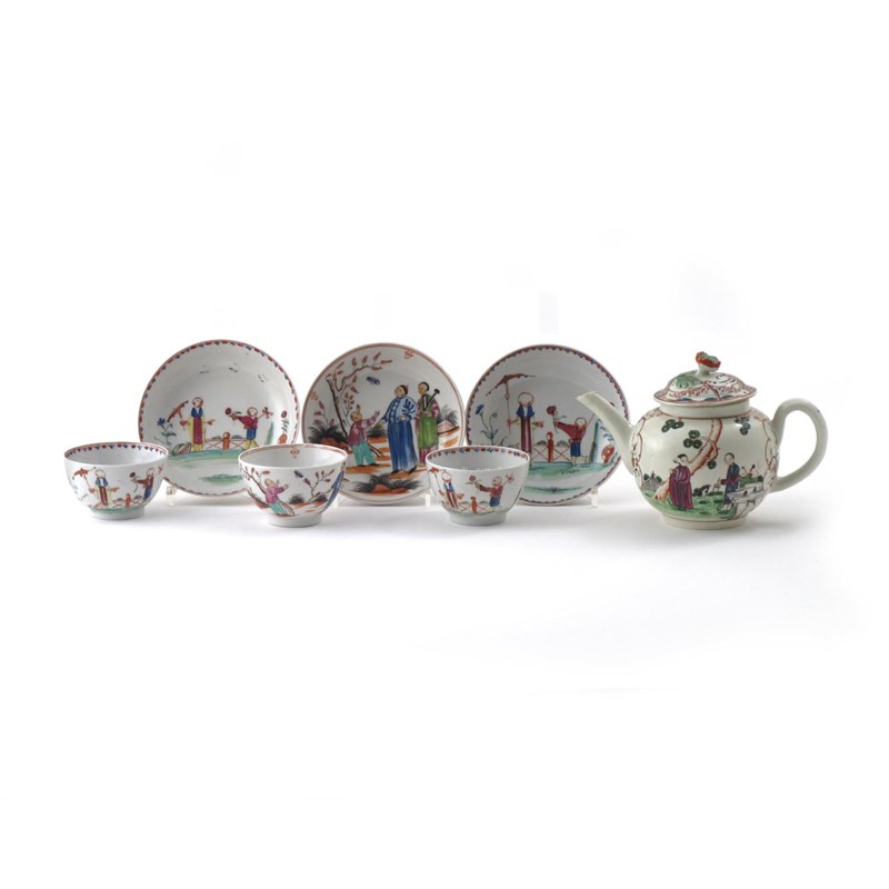 A pair of New Hall teabowls and saucers late 18th century, brightly painted in pattern 20 with Chinese figures in a garden, another teabowl and saucer with the Boy Chasing Butterfly pattern, and a Worcester teapot and associated cover similarly decorated with figures in a Chinese garden, 19.5cm max. (8)