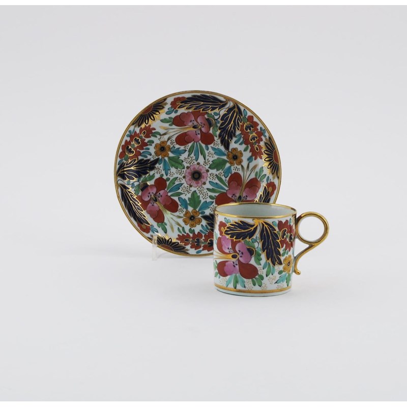 A good Barr Worcester coffee can and saucer c.1805, brightly decorated with a Japan pattern of flowers and foliage, incised B marks, 14cm. (2)