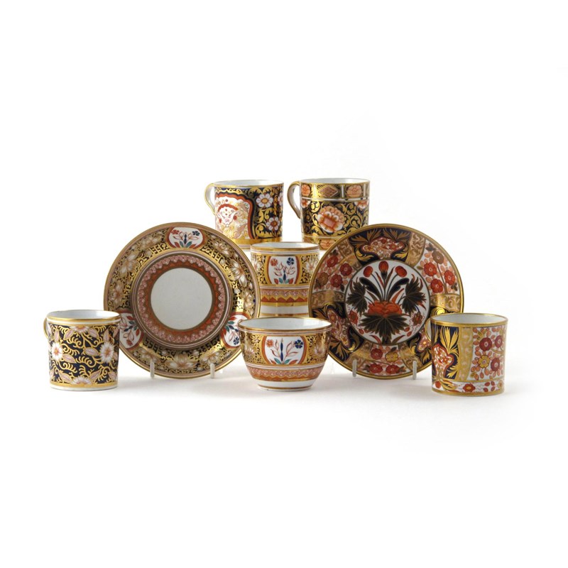Spode Imari teawares 1st half 19th century, richly decorated in floral Japan patterns. Comprising: a coffee can and saucer in pattern 1409, a trio, a can in pattern 1823, a can in 944, and another can. (8)