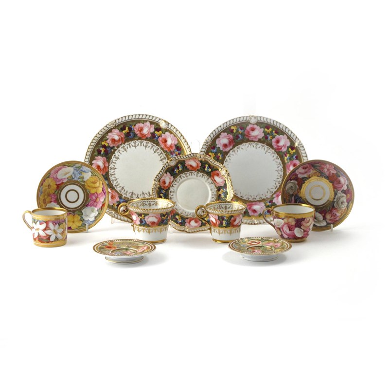 A Chamberlain's Worcester trio and two plates 1st half 19th century, richly decorated in pattern 924 with a band of pink rose and heartsease reserved on a gold ground, the cup handles with scrolling eagle heads, a teacup and saucer, a coffee can and saucer, and two cabinet cup stands, all similarly decorated with flowers on a gilt ground, 22cm max. (11)