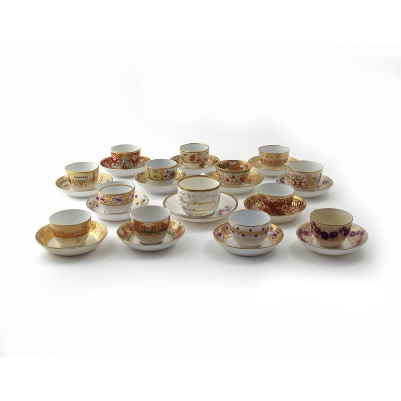 Fourteen English porcelain cups and saucers 19th century, including Spode, Minton, Coalport and Davenport, variously decorated with leafy borders, flowers, Oriental patterns, and gilt garlands, one inscribed for Mary Harrison, 16.5cm max. (28)