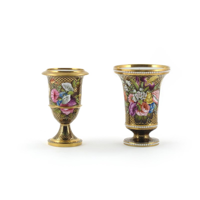Two Spode vases c.1815-20, both decorated in pattern 1166 with colourful floral arrangements reserved on a blue and gilt scale ground, one flared with bands of white beading, the other raised on a tall foot, iron red factory marks and pattern numbers, some damages, one cover lacking, 16.2cm max. (2)
