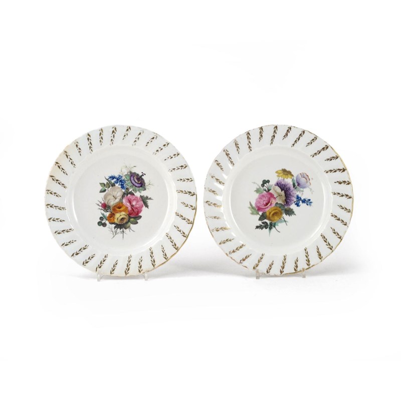 A rare pair of Derby plates c.1790-95, decorated outside of the factory probably by William Billingsley with floral arrangements within spiral moulded rims, puce potters stool marks to the reverse, 23.5cm. (2)