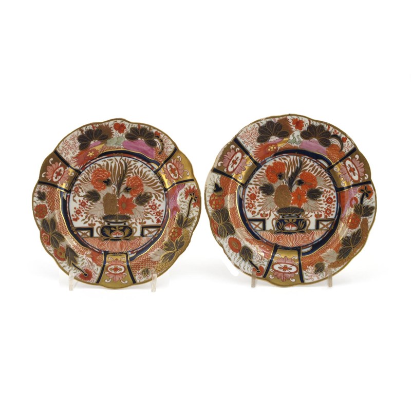 A pair of Chamberlain's Worcester cabinet plates c.1800, decorated in the Imari palette with pattern 240, a central vase of peony and leaves within a panelled border of birds and further flowers and foliage, purple marks to the reverse, 20.7cm. (2)