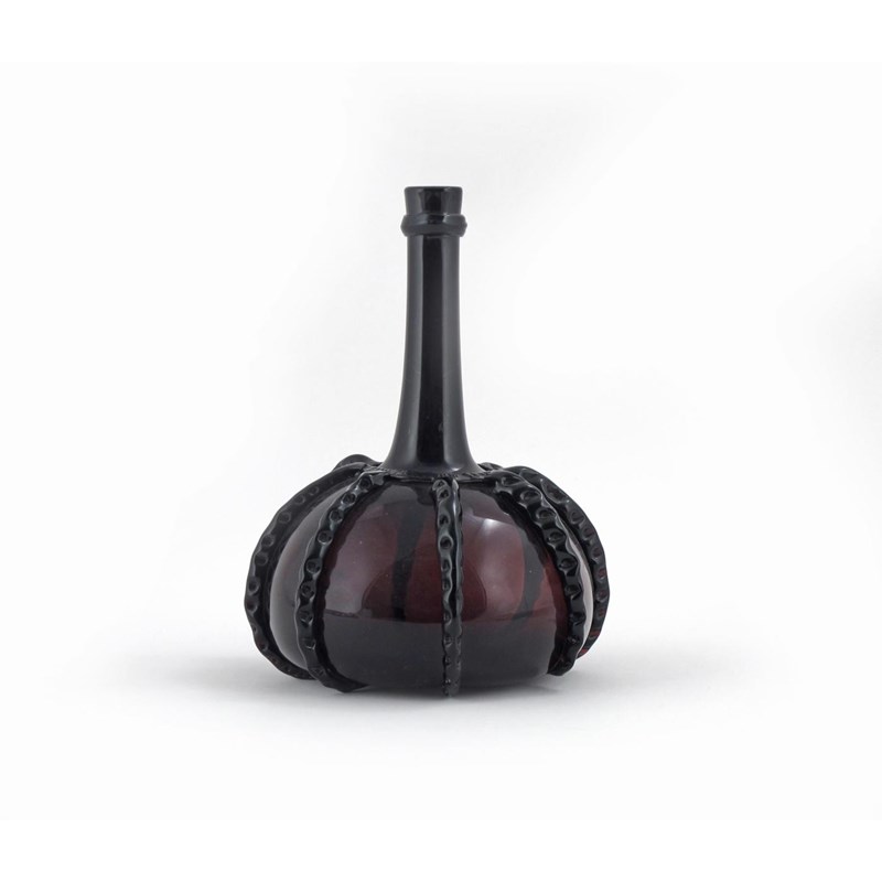 A good amethyst glass bottle or carafe probably Dutch c.1680-1700, the compressed body applied with vertical ribs, rising to a tall tapering neck, 22cm.
