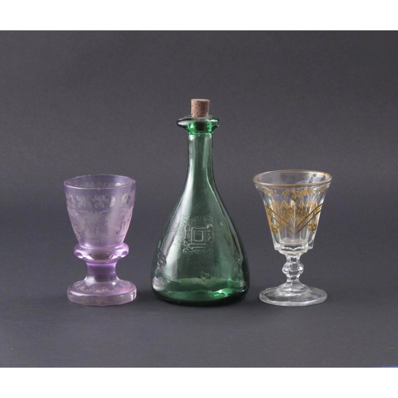 A Bohemian glass goblet 19th century, flashed in amethyst and cut with a stag and shell panels, a hexagonal cut goblet with gilt garlands, and a Continental green glass pouring bottle moulded with an armorial, 23cm max. (3)