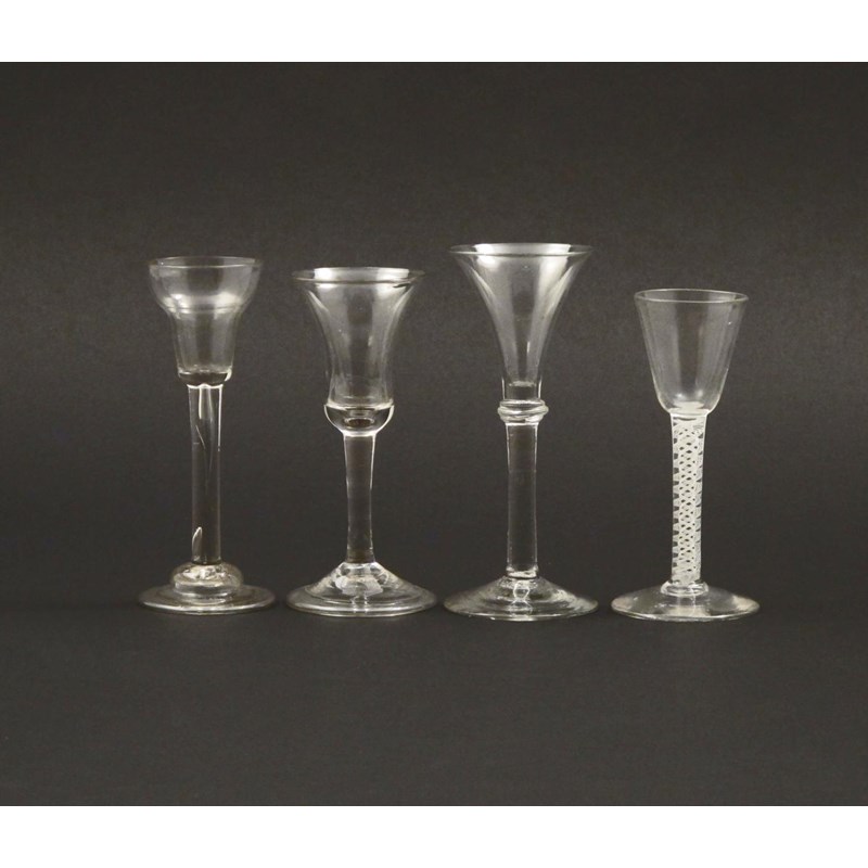 Four wine glasses 2nd half 18th century, one with a flared bowl raised on a double series opaque twist stem, one with an ogee-shaped bowl, the other with a bell-shaped bowl, both raised on folded feet, 16cm max. (4)