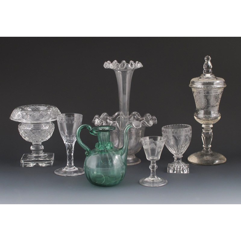 A mixed collection of glass 18th century and later, including a small epergne, an engraved goblet and cover, a cut glass footed bowl with everted rim, a green oil jug, and three small glasses, some faults, 23cm, max. (8)