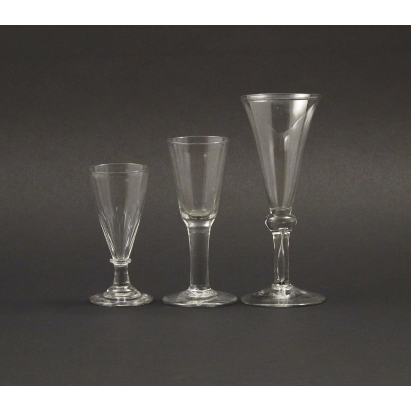 A large glass 2nd half 18th century, the tall flared bowl raised above a knopped teardrop stem, a narrow wine glass above a thick plain stem, and a smaller glass cut with facets, 20.5cm max. (3)