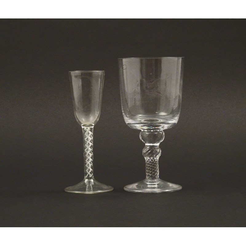 A large glass goblet and an 18th century style glass modern, both by Peter David, the goblet faintly etched with tigers, the other glass with a titled portrait of George III, raised on a multi-twist stem, 20.5cm max. (2)