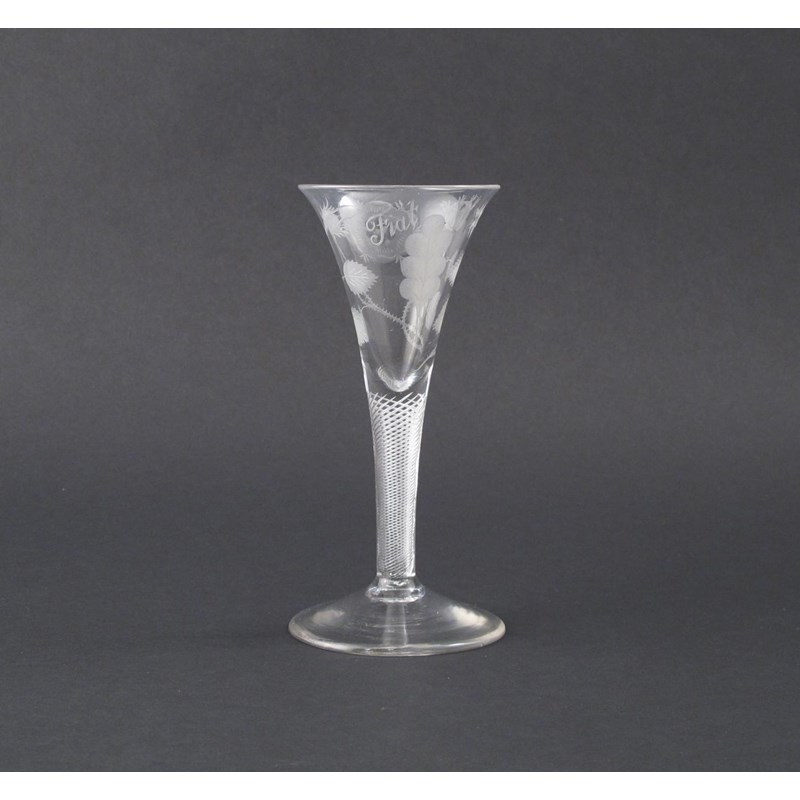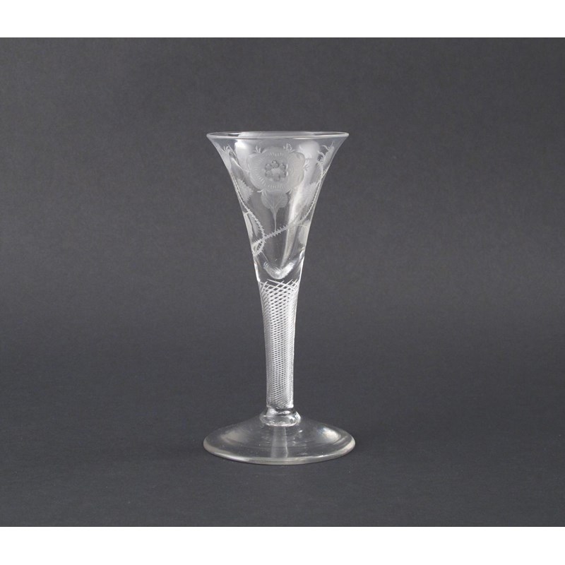 A wine glass of Jacobite type c.1760, the drawn trumpet bowl rising from a thick airtwist stem and engraved with an oakleaf, star, rose with two buds, and 'Fiat', 17cm.