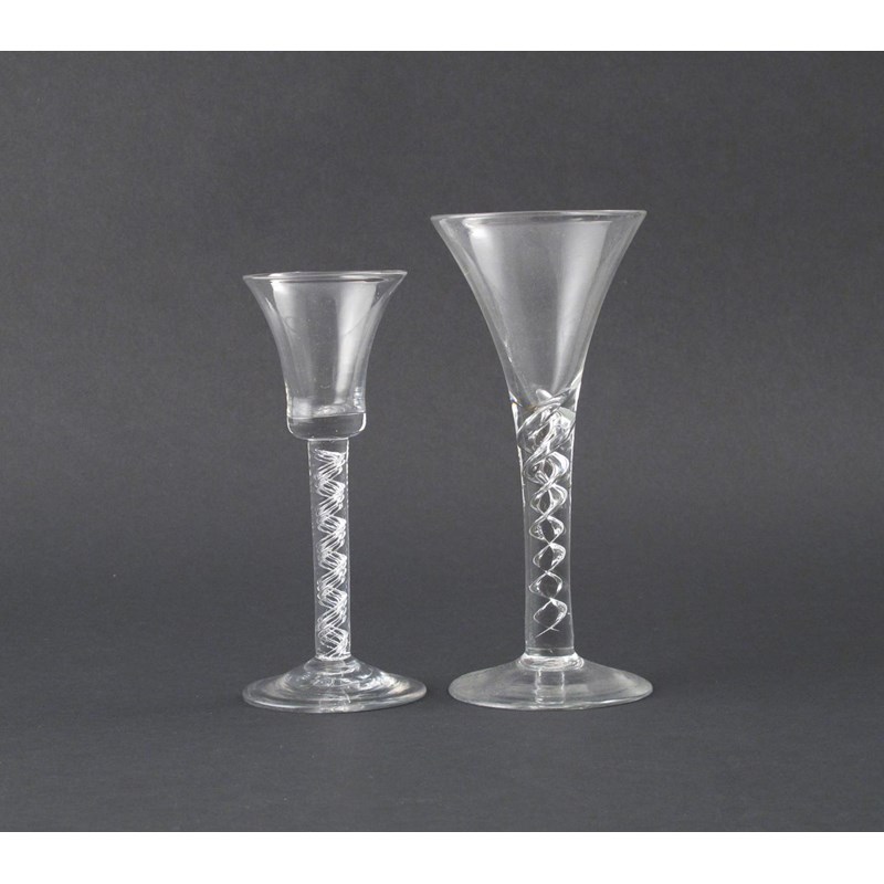 Two wine glasses c.1760, one with a drawn trumpet bowl, the other with a waisted bucket bowl, both raised above mercury airtwist stems, 17.5cm max. (2)