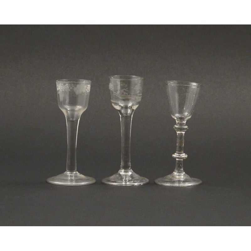 Three wine glasses mid 18th century, all raised on folded feet, two with plain stems, one with a knopped stem, one bowl engraved with a hound chasing a stag, another with continuous grapevine, 14.7cm max. (3)