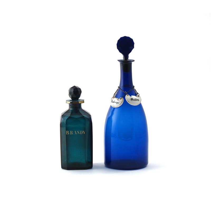 Two coloured glass decanters and stoppers 19th century, one of chamfered square green glass, titled 'Brandy' in gilt, the other blue with a flattened stopper, together with two Continental porcelain wine labels titled 'Madere' and 'Malaga', a few small chips, 30cm max. (6)