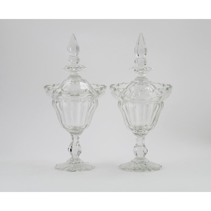 A pair of cut glass sweetmeat jars and covers, the flared, faceted bowls with elaborate shaped rims, rising from knopped stems above hexafoil feet, the domed covers with tall pointed finials, a few small chips, 37cm. (4)