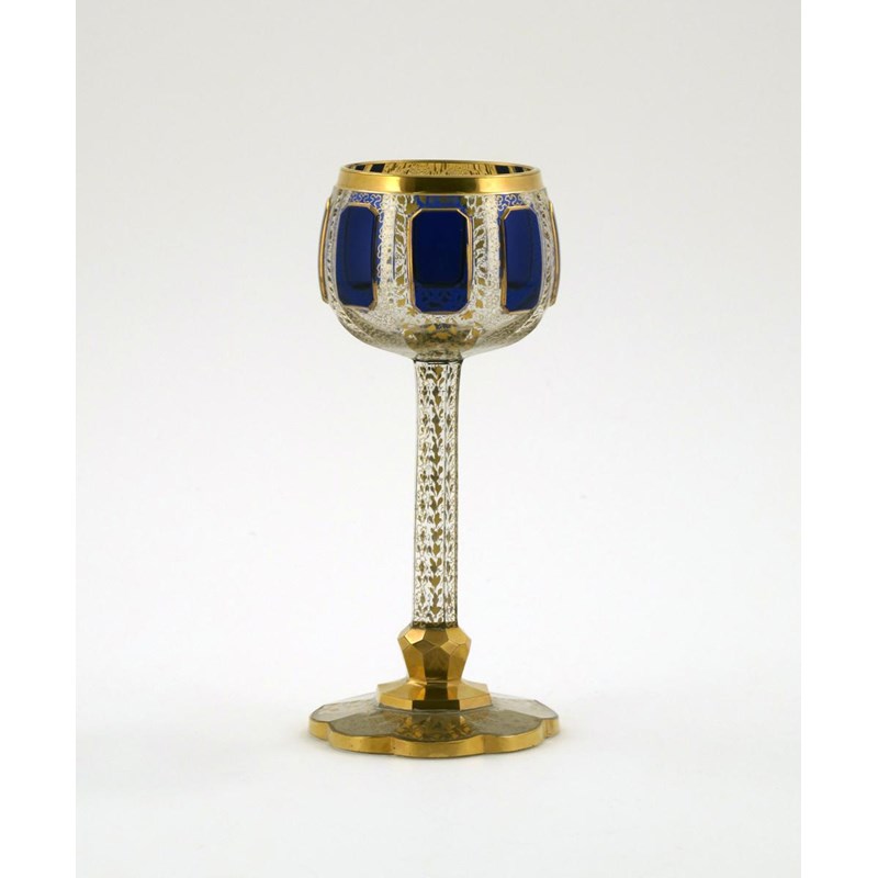A good Bohemian glass goblet 19th century, the wide bowl overlaid with chamfered rectangular panels of blue glass reserved on a foliate and vermicelli ground, raised on a faceted stem and a lobed starcut foot, 19cm.