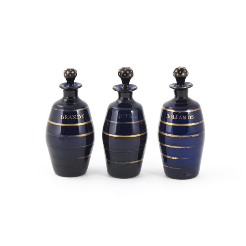 A set of three blue glass decanters and stoppers c.1800, the barrel-shaped bodies decorated with gilt horizontal bands and titled 'Rum', 'Brandy' and 'Hollands', the faceted stoppers with star motifs and initialled, 20cm. (6)