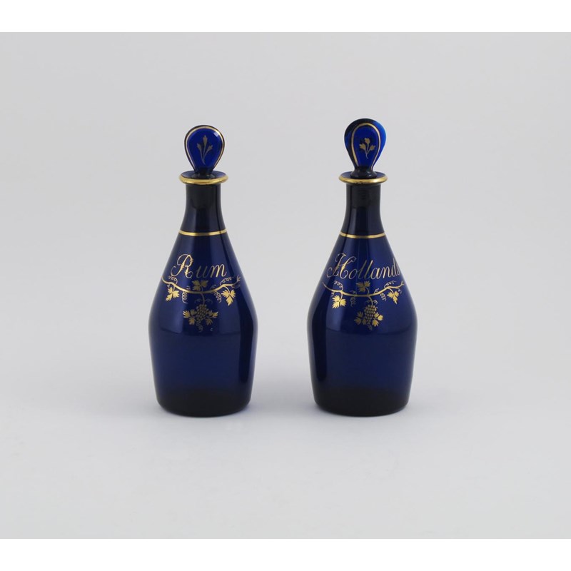 A pair of blue glass decanters and stoppers c.1800, titled in gilt with 'Rum' and 'Hollands' in elaborate script with grapevine motif, the flattened stoppers with a leaf sprig, some regilding, one stopper reduced, 23cm. (4)