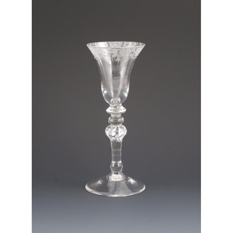 A Newcastle light baluster glass c.1750, the narrow bell-shaped bowl engraved with a wide rim of of flowers, leaves and scrolls set with polished circles, the stem with a knop containing two rows of tears, 17.2cm.