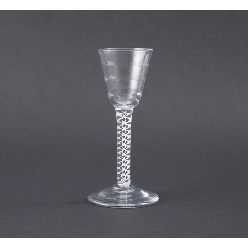 A Lynn wine glass c.1760, the funnel bowl with horizontal ribs, raised on a double series opaque twist stem, 15cm.