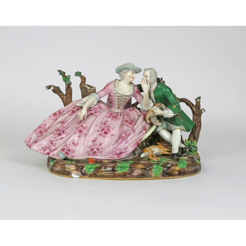 A Meissen porcelain crinoline group 19th century, of two lovers seated beneath a tree and leaning in for an embrace, he holding a gamebird and with a dead hare at his feet, blue crossed swords mark, incised 468, damages to the tree, 26.5cm across.