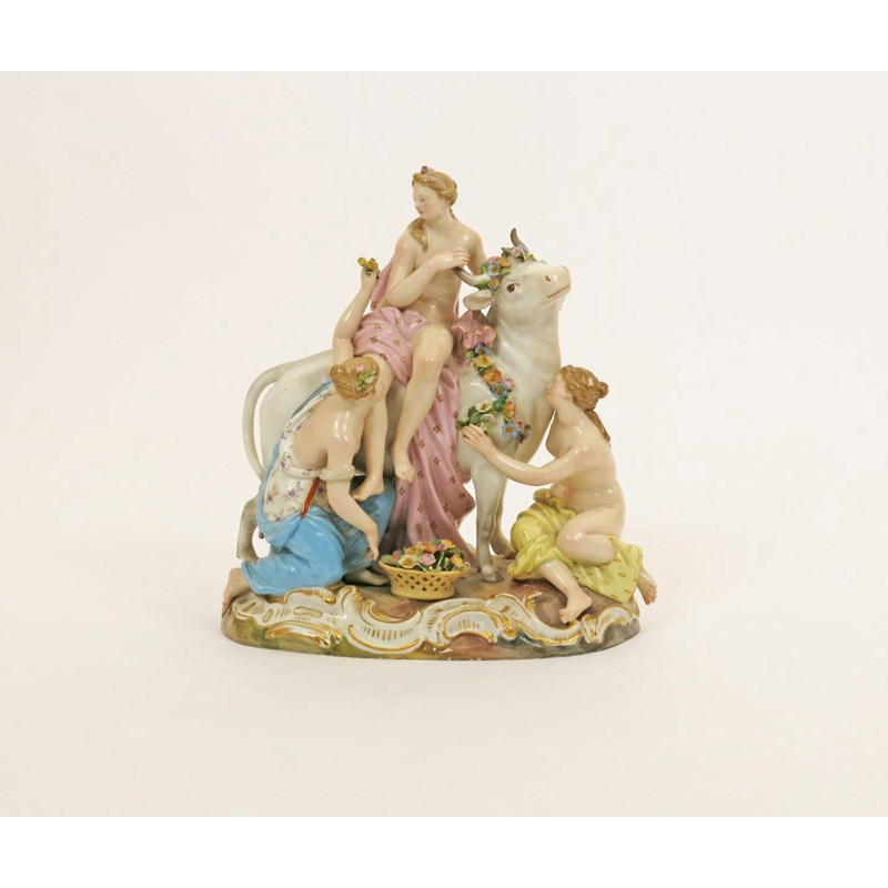 A Meissen group of Europa and the Bull 19th century, after the model by J J Kändler, Europa seated on the back of the bull and draped in a pink robe, attended by two maidens who garland her steed with flowers, 21cm.