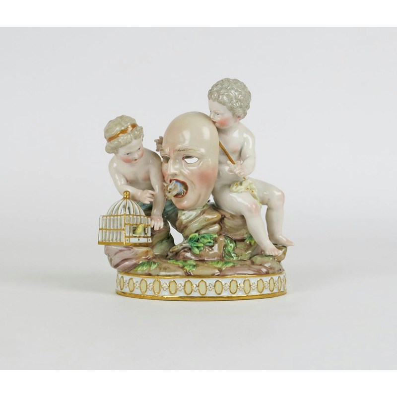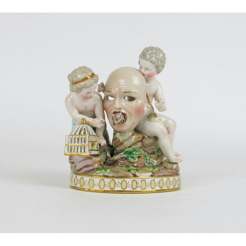 A Meissen figure group of putti 19th century, after the model by J C Schönheit, either side of a large mask resting on a rocky outcrop, a small cat emerging from the mouth, a bird in a cage to one side, blue crossed swords mark, incised H88, a chip to the cat, 14cm.