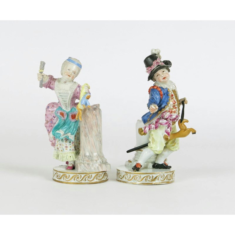 A near pair of Meissen figures of children with toys 19th century, the boy riding a hobby horse and wearing an elaborately plumed hat, the girl spanking her doll, each raised on a circular base with gilt scroll design, blue crossed swords marks, the girl incised E95, some damages and restorations, 16cm. (2)