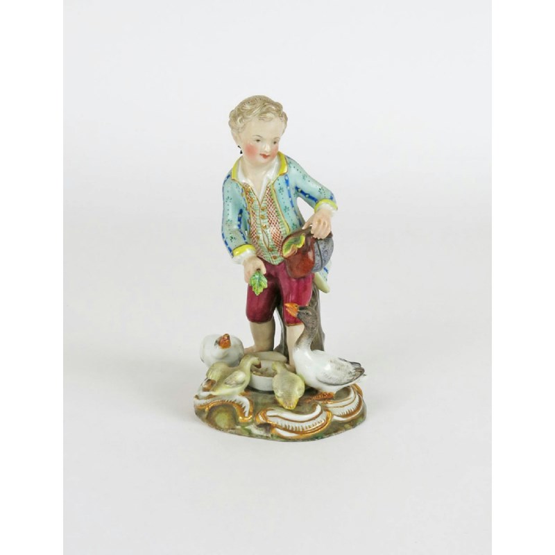 A Meissen figure of a boy 19th century, feeding a pair of geese and a pair of ducks from a bowl between his feet, proffering leaves from his bag to the hungry birds, blue crossed swords mark, incised C41, 12.3cm.