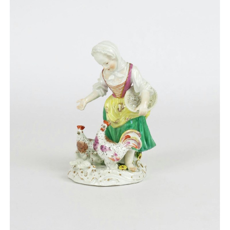 A Meissen figure of a girl feeding chickens mid 18th century, scattering corn from a shallow basket beneath her left arm, feeding a family with six chicks, blue crossed swords mark, some good restoration, 12.5cm.