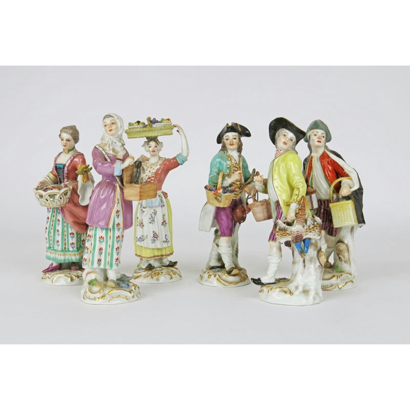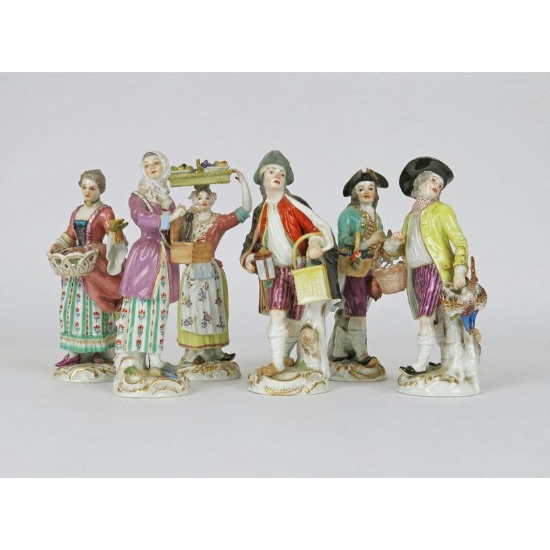 Six Meissen figures from the Cris de Paris series 20th century, including a rabbit seller, the Night Watchman, a grape seller, an egg seller, a fruit seller and a flowergirl, all after the original models by Peter Reinicke, modelled with their various wares, the night watchman carrying his lantern and a basket with bottles of wine, all raised on low scrolled bases with gilt detailing, blue crossed swords marks, minor damages, 15cm. (6)