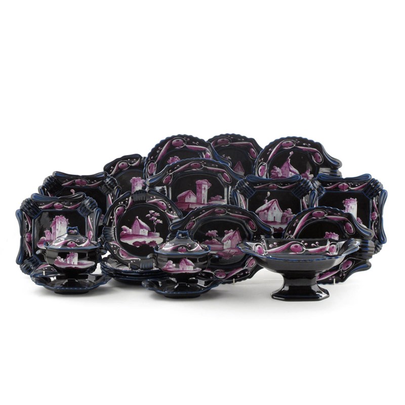 A good Thomas Lakin & Co pearlware dessert service c.1820, the dark surfaces enamelled in white and purple with rococo buildings in rural landscapes, the rims with a stylized fruit border. Comprising: an oval comport, two sauce tureens and covers, two oval dishes, four square dishes, four shell-shaped dishes and six plates. (21)