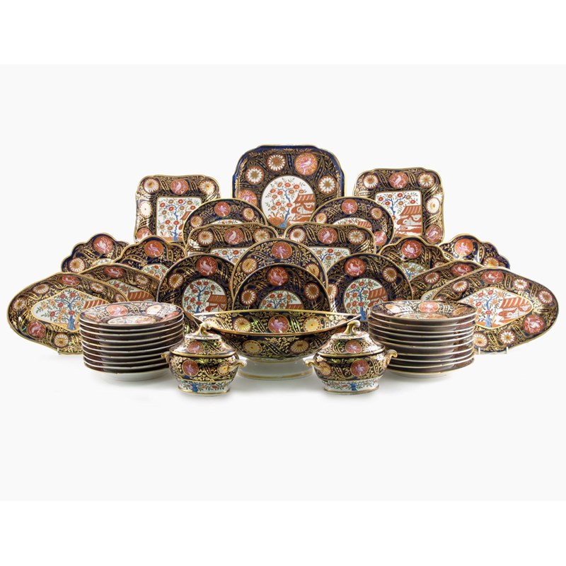 A fine Coalport dessert service c.1810, well painted in the Japanese manner with central panels of pagodas beneath flowering prunus trees, within wide borders of birds in branches and flowerhead mon in an Imari palette, minor faults. Comprising: twenty four plates, a pair of oval sauce tureens with covers and stands, four square dishes, four oval dishes, four shell-shaped dishes, a square tray and an oval serving bowl. (44)