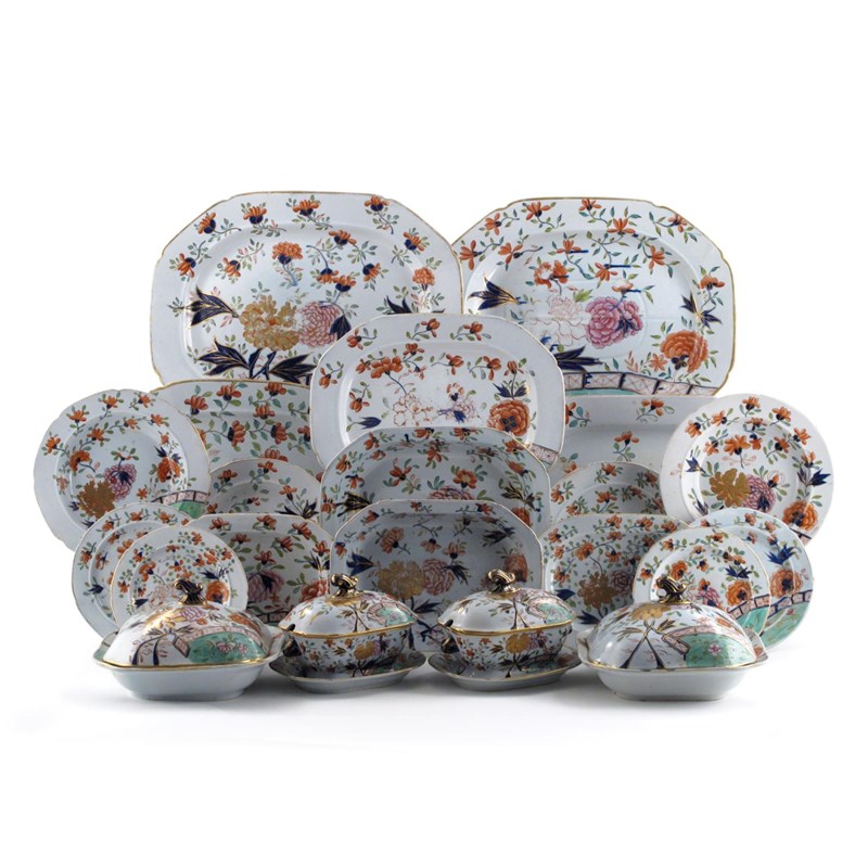 An extensive combined stone china dinner service 19th century, including Ashworth and Mason's, boldly painted with an Imari pattern of chrysanthemum blooms and other flowers above a fence, impressed marks and pattern number 4/278, some wear and damages. Comprising: twelve rectangular dishes in five sizes, two square tureens and covers, two sauce tureens with covers and stands, two rectangular dishes, a square bowl, 21 dinner plates, 11 smaller plates, ten soup plates and 12 side plates. (79)