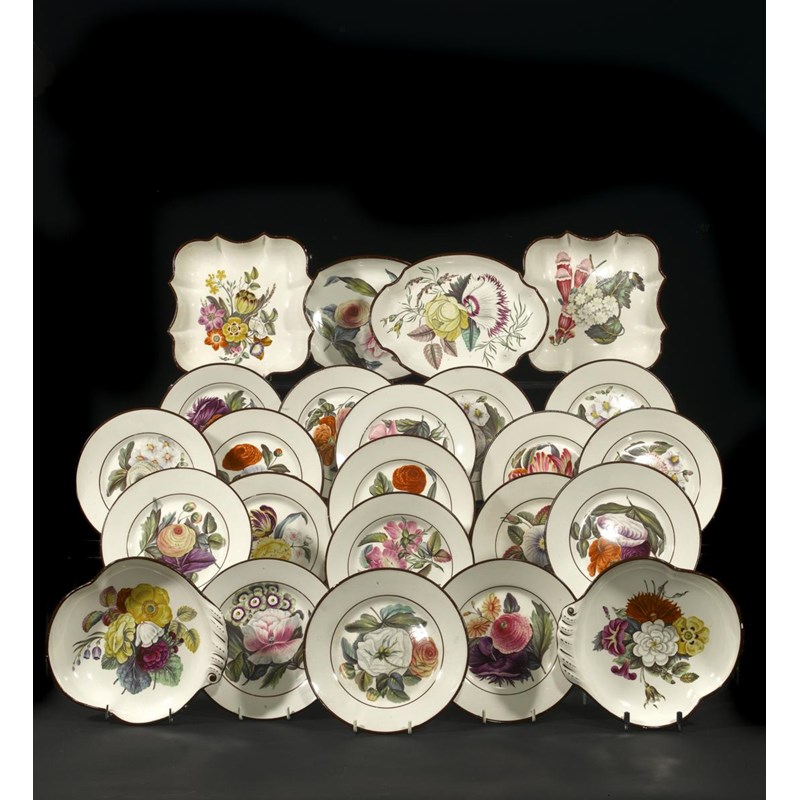 A rare Don Pottery botanical dessert service c.1810, each piece boldly painted with a variety of colourful blooms in bright enamels, brown line rims. Comprising: two shell-shaped dishes, two square dishes, two oval dishes and eighteen plates. (24)