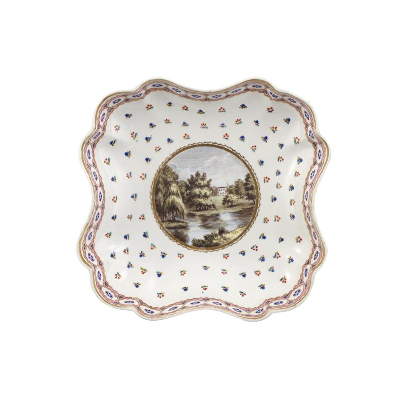 An extremely rare Caughley square dish c.1790-93, painted with a panel containing a distant stately home in the background of a lakeside scene with weeping willow and other trees along the banks, reserved on a ground of tiny stylized flower sprigs within a pink band border with a continuous oval design, a little gilt wear, 20.2cm.