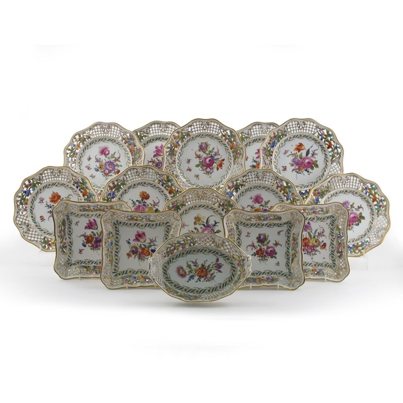 A Carl Thieme (Potschappel) part dessert service late 19th century, the wells brightly painted with flowers within gilt and green scroll borders, the rims reticulated with floral panels, blue monogram marks. Comprising: four square dishes, a two-handled dish and ten plates. (15)